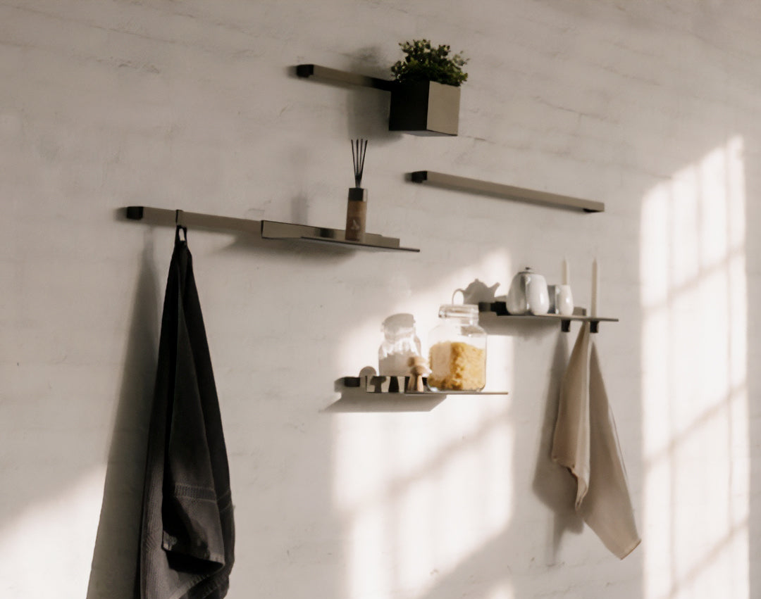 T-serien og L-serien kan være den perfekte løsning i alle rum, begge produkter har stor fleksibilitet i sin anvendelse. Den sorte pulverlakerede stål er slidstærk og modstandsdygtigt overfor fugt, ridser og mister ikke sit udtryk over tid. Messing detaljerne patinerer med tiden og giver et nyt udtryk til rummet.