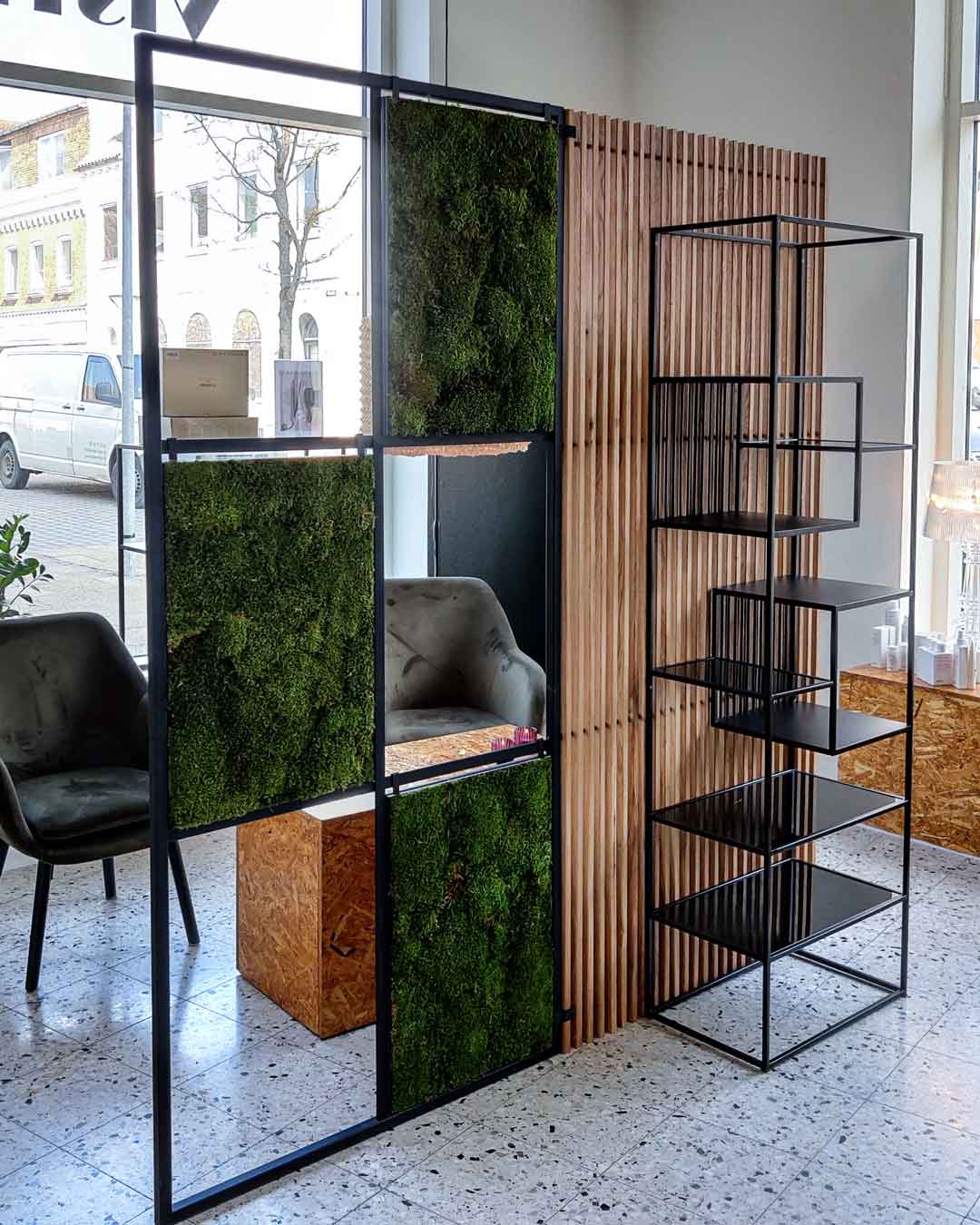 O6 The room divider with three large deck boxes, and an integrated moss frame creates a living green wall that elegantly defines the room. A perfect balance between functional space sharing and aesthetic plant wall.