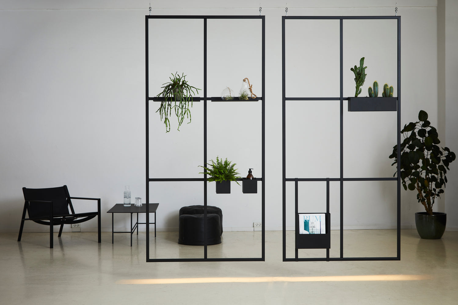 O6 The height of the room divider, with its simple construction, creates new possibilities in the room. The black powder coated steel provides a stylish frame for the three integrated deck boxes that can be personalized with plants and decorations. A flexible solution that both defines and beautifies the room.