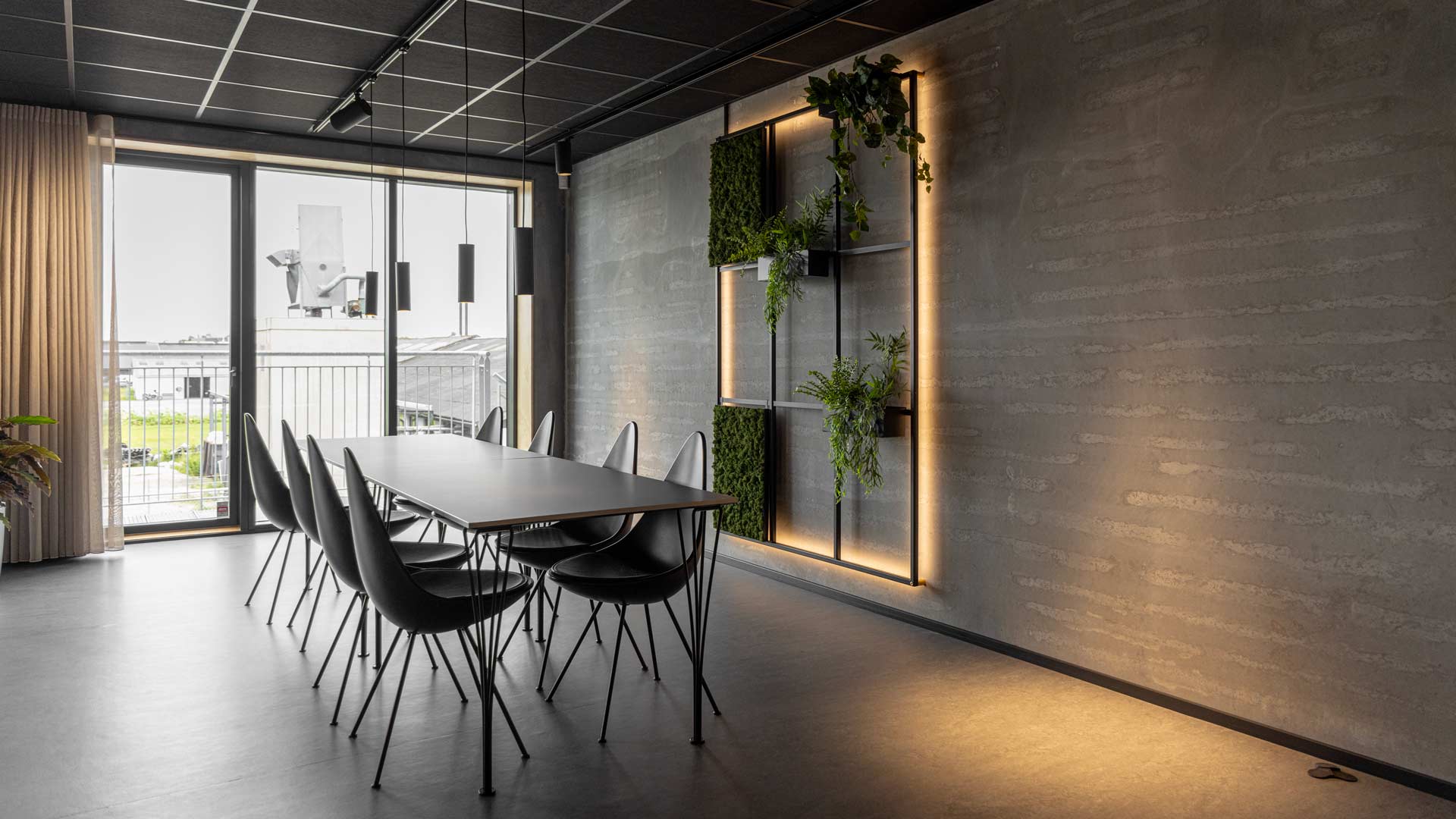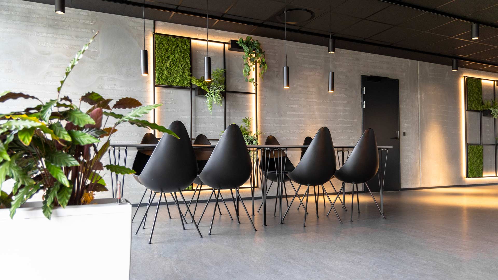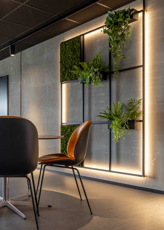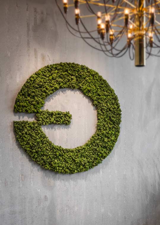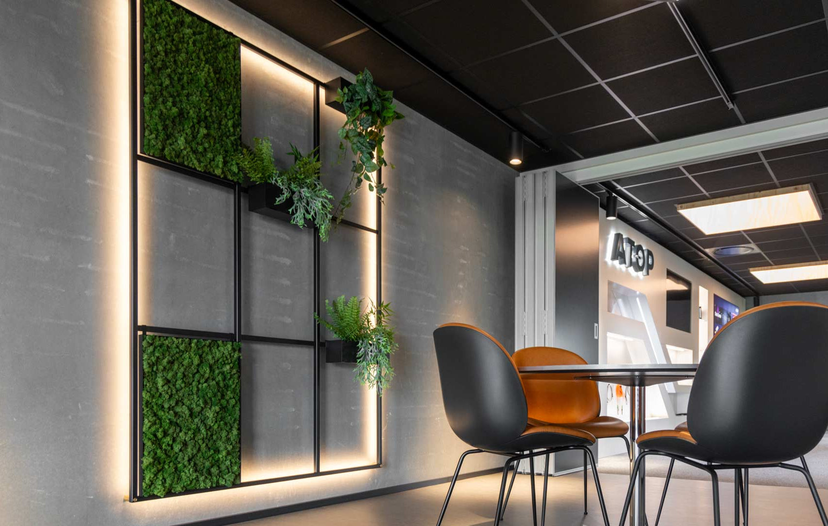 Den grå beton bliver komplimenteret af det sorte pulverlakerede stål, det grønne og levende mos samt planternes naturlige look. Det skaber hos Atop en atmosfære der forbinder industrielle designelementer og materialer med naturen og tilføjer liv til rummet.