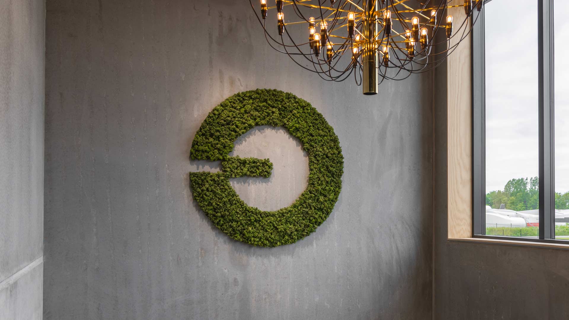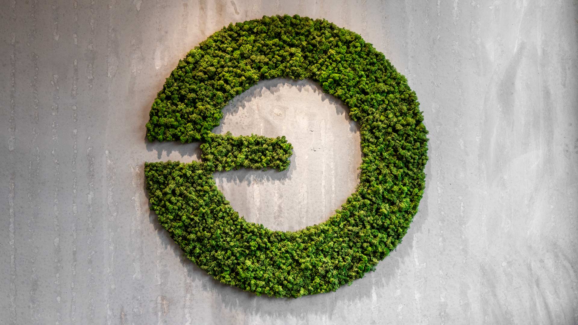 Det er ikke altid nemt at indrette store vægge, særligt da det ofte kræver store dekorationer for at fylde det tomme kanvas ordentligt. Derfor valgte Atop, i samarbejde med os, at få produceret et stort mosbillede udformet som deres logo. Det væghængte logo ses centralt ved indgangen til deres lager og ligeledes når man bevæger sig op af trappen til deres mødelokale.