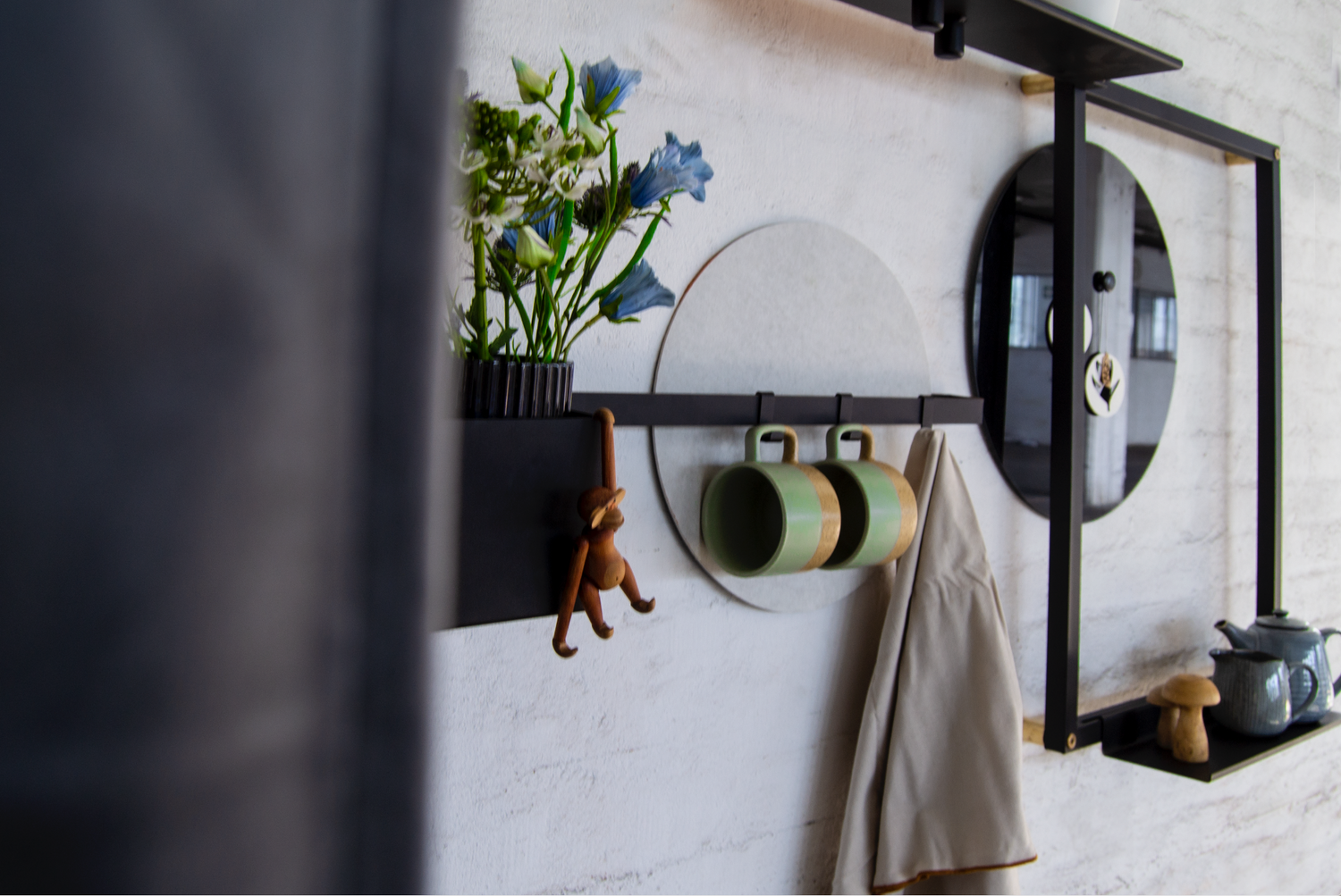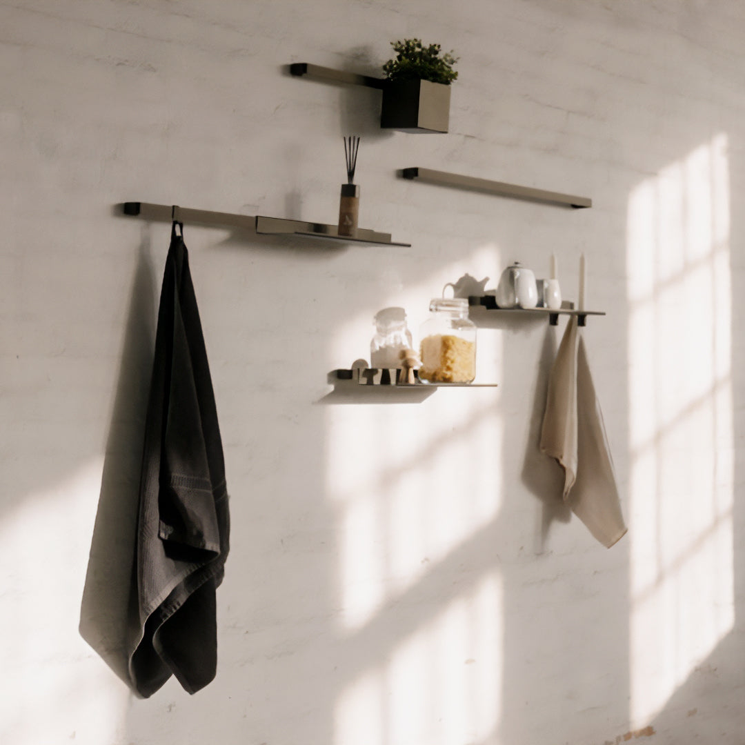 LINE hylderne skaber et enkelt og elegant udtryk på væggen. Det sorte pulverlakerede stål danner en minimalistisk ramme, der giver plads til både det praktiske og det dekorative. Med forskellige længder kan du skabe din egen personlige komposition, der passer perfekt til dine behov.